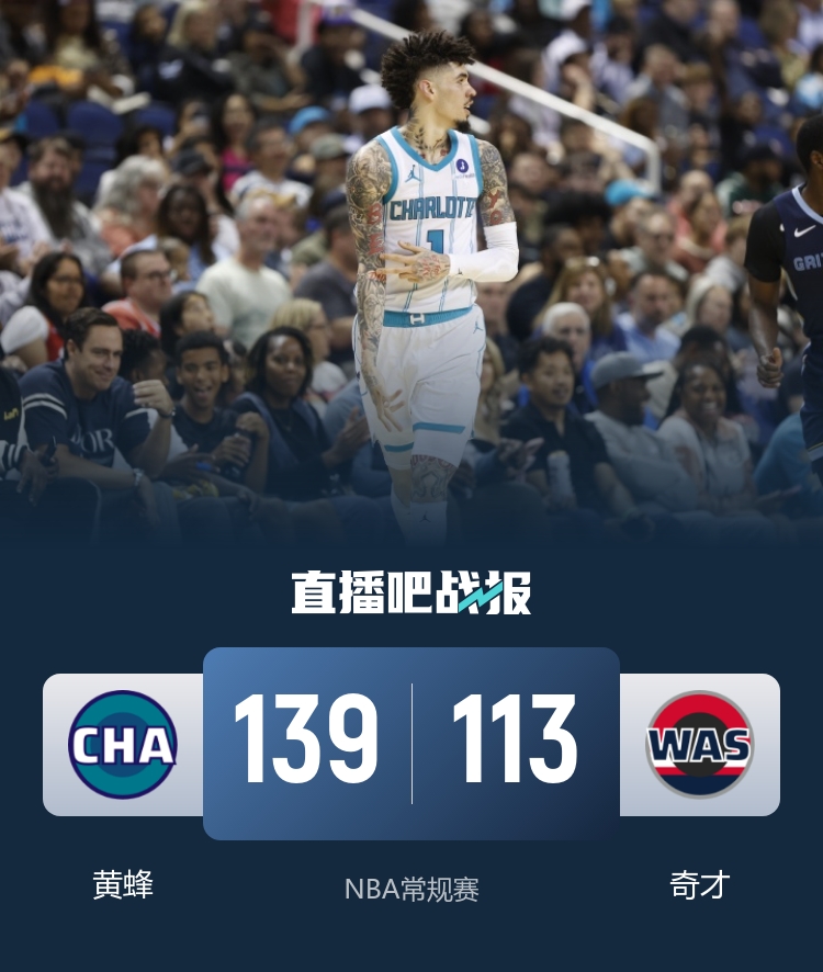 比赛开始,奇才连续反击打出6-0,但三球有攻有传单节轰下15分带领黄蜂咬住,奇才全民皆兵回应,双方展开对攻战,首节黄蜂领先1分,次节双方继续拉锯战,惠特摩尔连续送下饭操作,三球苦苦支撑,萨尔里突外投单机上双,最后2.4秒压哨长两分助奇才领先到11分。下半场,克尼佩尔连续三分止血,麦科勒姆三分回应,随后奇才突然断电,黄蜂11-0反超比分,塞恩-詹姆斯又连续三分领先到7分,末节双方继续对攻,黄蜂保持住10分左右领先,随后黄蜂连续外线发炮直接一波带走比赛,最终黄蜂139-113轻取奇才。